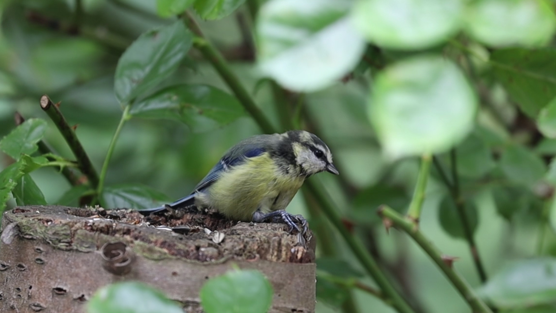 Blaumeise versucht den Sonnenblumenkern zu öffnen.