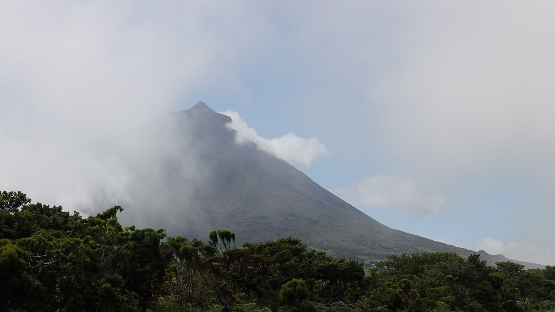 Man kann oft zuschauen, wenn die Nebel- und und Wolkenschwaden die Sicht auf den höchsten Berg (2351 m) der Azoren kurz freigeben. ![]()