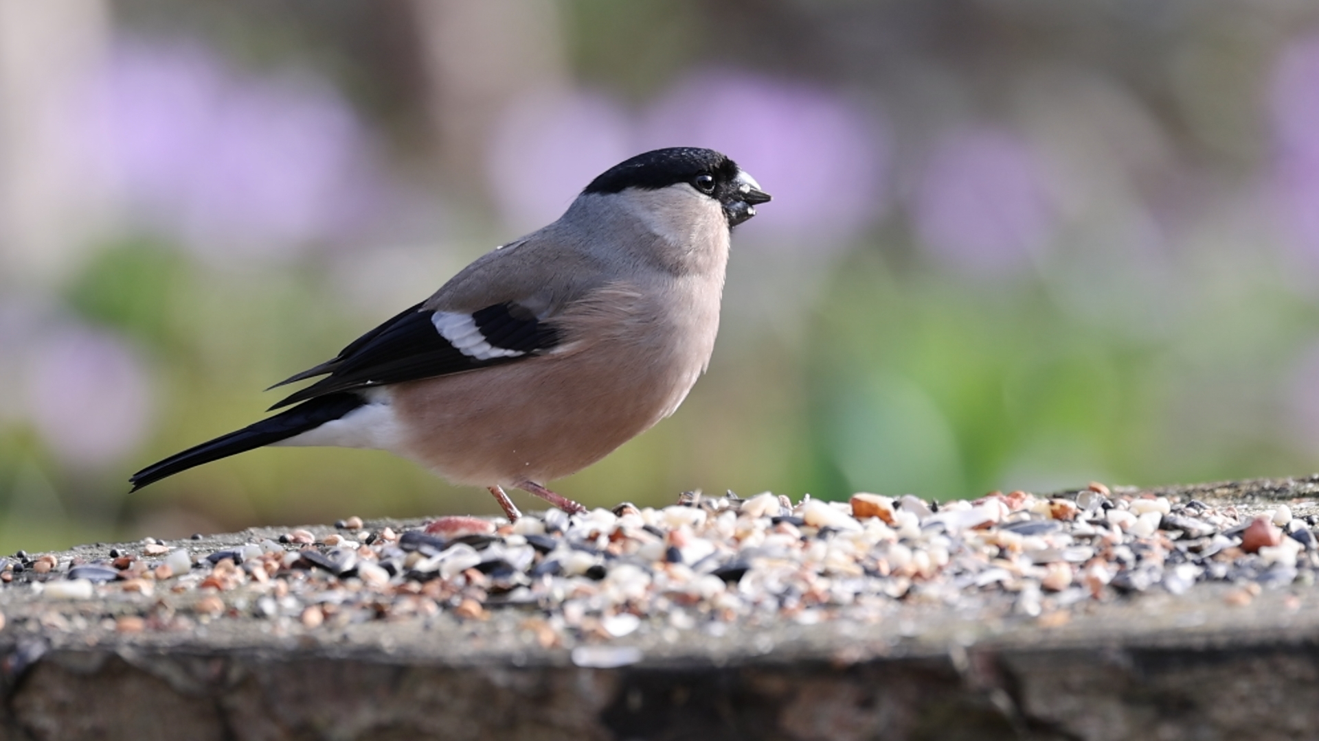 Ein Dompfaff (w) im Garten an der Futterstelle