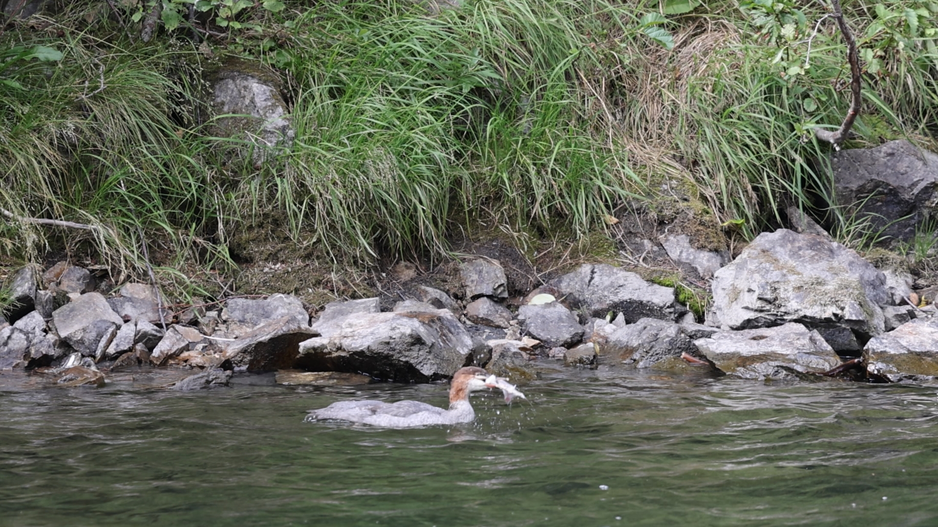 Dieser Gänsesäger müht sich mit einem Fisch ab.