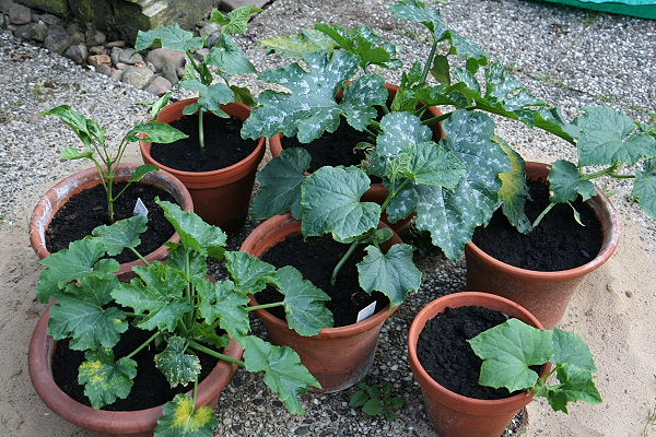 in den anderen Töpfen habe ich 4 Gurken, 1 Paprika und 2 Zucchini. (BIld 2) Leider ein Leckerbissen für die Schnecken, also bleiben sie in den Töpfen und rund herum haben wir einen Sandring gelegt. Das hilft phantastisch. Keine Schnecke kommt mehr daran ;D