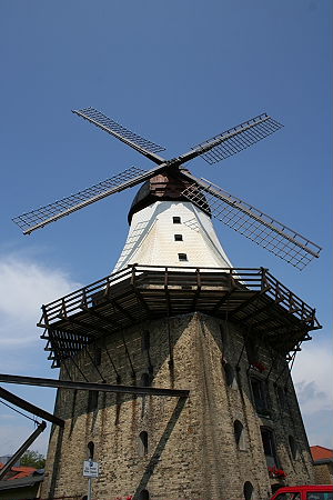 Amanda (Bild 1) die Holländische Windmühle, 1888 erbaut. Es ist die größte Holländer Windmühle Schleswig Holsteins. Sie ist 30 m hoch, hat 8 Stockwerke, Flügeldurchmesser 23 m. Man kann diese Mühle kostenlos besichtigen, im 1. Stock ist die Tourismus Information, weiter oben das Standesamt!