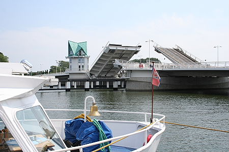 Die moderne Doppelspur-Klappbrücke (Bild 3) ist erst wenige Jahre alt. Immer um Viertel vor, wird sie für den Schiffsverkehr hochgeklappt.