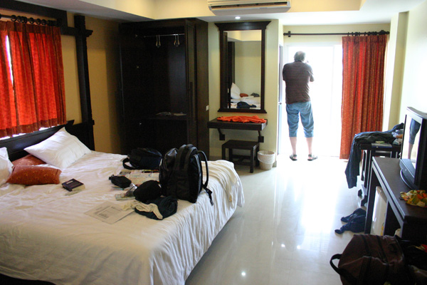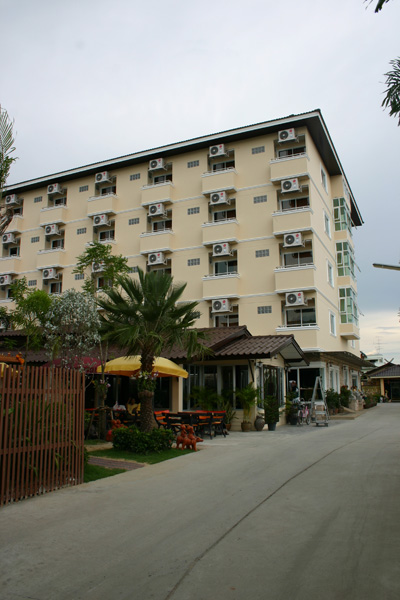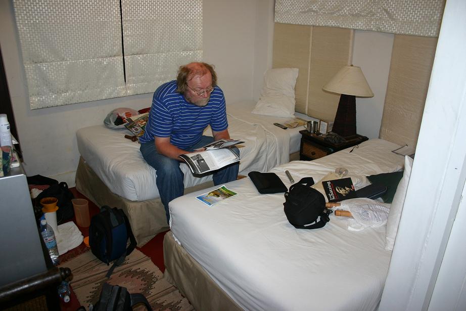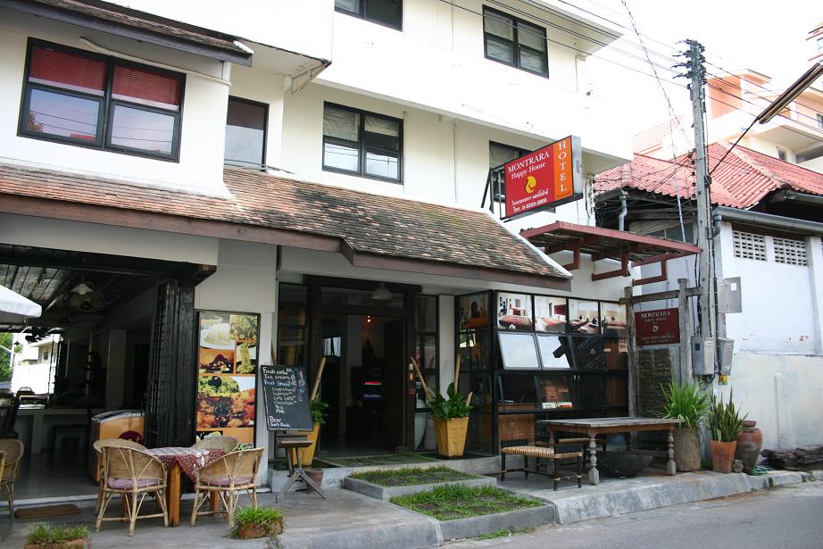 Vor dem Flughafengebäude stehen jede Menge Taxifahrer und wir lassen uns von einem mitschleppen. 120 Baht (Nochmals: 1 Euro = Baht : 50) kostet die Fahrt bis zum Hotel – Standardpreis für die Fahrt in die Stadt. Dauert nicht lang, vielleicht auch so 15 Minuten. Der Taxifahrer plappert munter drauf los. Wir hätten Glück – letzte Woche sei das Wetter sehr schlecht gewesen, jetzt besser. Stimmt, es regnet erst am Abend und auch das nicht all zu lang. Er hat auch ein Album im Auto liegen, das sollen wir anschauen – my home, my village,my people .... Er kommt aus den Bergen und es sieht interessant aus, da wo er herkommt Sein Vater hätte zwei Elefanten und die Frauen mit den langen Hälsen, das sei auch sein Dorf .... haben wir jedenfalls verstanden. Ob wir nicht mit ihm eine Tour zu seinem Dorf machen wollen – 20 Dollar für einen Tag, oder 900 Baht. Nur für uns. Wir wollen und verabreden uns mit ihm für morgen 10.00 Uhr vor dem Hotel.Im Hotel, das Montrara Happy House Hotel, klappt auch alles. Obwohl es ja noch sehr früh, bekommen wir unsere über venere.com im Voraus reservierten Zimmer. Statt einem Einzel- und einem Doppelzimmer sind es zwei Doppelzimmer zum vereinbarten Preis. Uns egal oder gut so. Sie liegen nicht auf der gleichen Ebene sondern übereinander auf 2 Stockwerken. Auch kein Problem. Unter unserem Zimmer ist der W-Lan Anschluss und siehe da, er funktioniert in beiden Zimmer einwandfrei und kostenlos, obwohl in der Beschreibung stand, es gäbe keines kostenlos! Es leben die ungesicherten Netzwerke und ein ein eigenes Laptop oder so was wie ein EEE-PC.