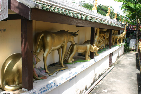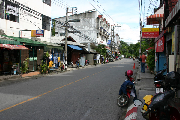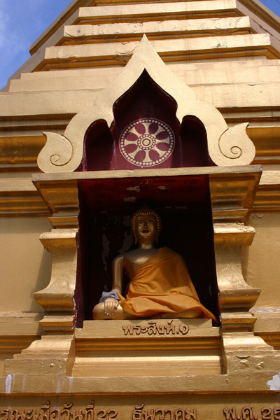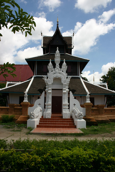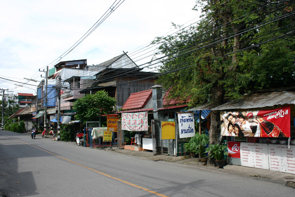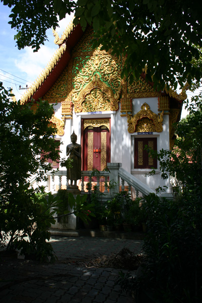 Wir gehen weiter die Singharat Road entang bis zum Stadtgraben, und kommen an weiteren Wats vorbei, z.B. Dab Phi. Beim Stadtgraben biegen wir in die Sriphum Road und kommen vorbei beim Wat Mounthien,dem Wat Khuan Ka Ma und dem Wat Mor Kham Thuang. Danach schwirrt uns der Kopf vor lauter Wats und wir suchen ein Restaurant, in dem wir was essen können. Es wird wieder ein Fried Rice with... Gericht und Getränken für uns drei für 200 Baht.