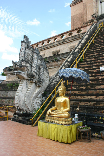Als nächstes kommen wir zum Gelände des Wat Chedi Luang. Ein Wat ist übrigens ein Gebäudekomplex, der in der Regel von einer Mauer umgeben ist und religiösen Zwecken dient. Der Wat Chedi Luang ist ein großes Tempelgelände mit verschiedenen Gebäuden. Laut Wikipedia ist das Wort „Chedi“ eine thailändische Adaption eines Wortes aus der Buddhasprache und bedeutet „aufhäufen, in eine Bestimmten Ordnung anhäufen.“ Damit ist nicht nur eine Anhäufung im architektonischen Sinne gemeint, sondern auch im inneren wie eine (Er)mahnung, Die Chedis auf Tempelanlagen sind turmähnliche Gebäude von ganz klein (teils Begräbnisstätten) bis ganz groß.