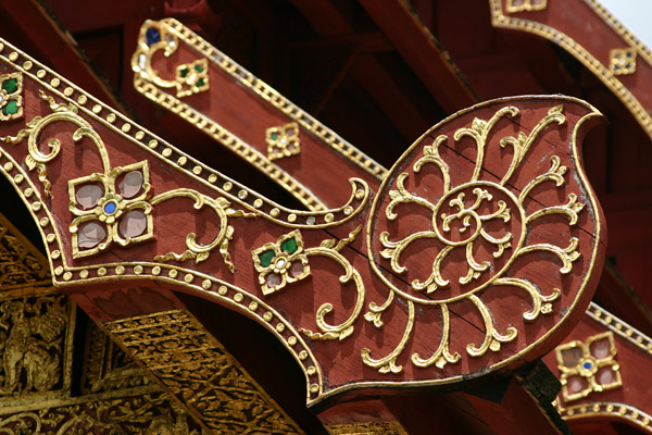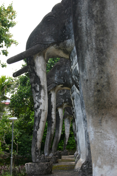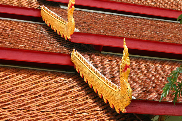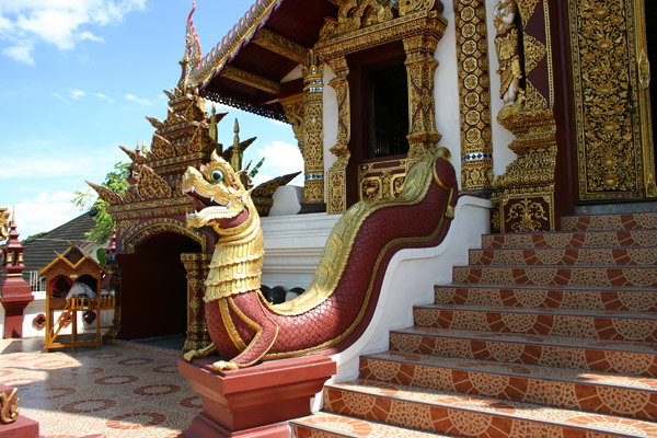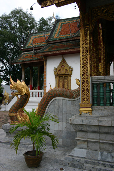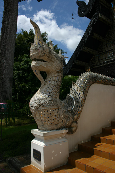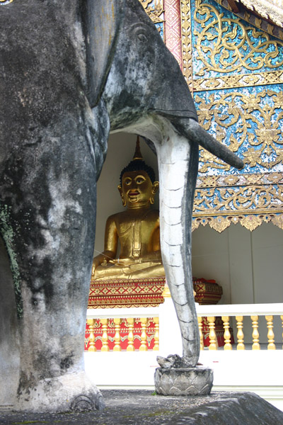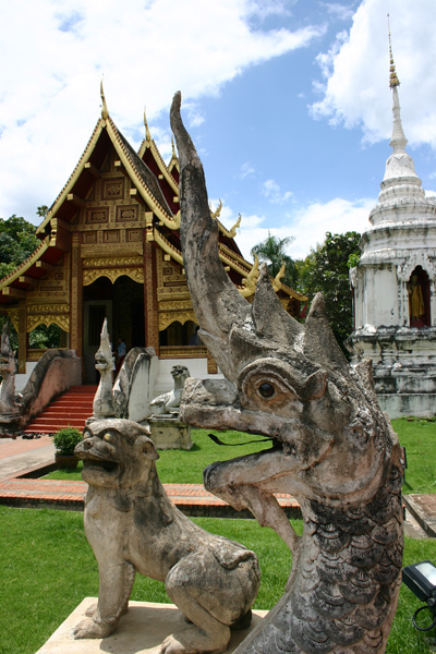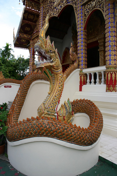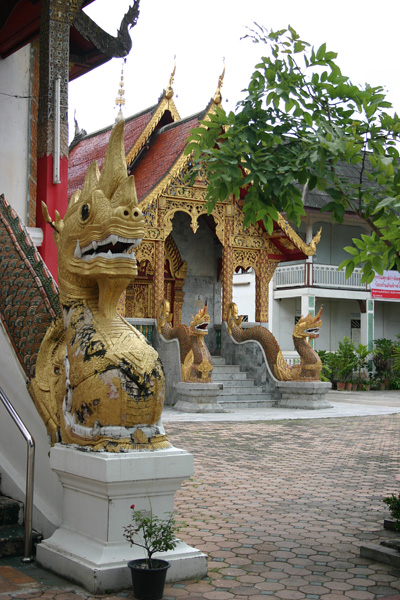 So gestärkt geht es weiter zu dem in der Ratchaphakhanai Road liegenden Wat Chiang Man. Das ist der älteste Wat in Chiang Mai aus dem Jahre 1296. Der Viharn hat ein zweigestaffeltes Dach mit züngelnden Naga und zeigt noch seine ursprüngliche Form. Der Giebel an der Portalseite ist auffallend reich geschnitzt.Den Eingang frankieren zwei Löwen. Im Inneren gibt es ganz viele Buddhas. Auf der Anlage befindet sich auch ein Chedi mit 15 Elefantenfiguren. Eine Naga bedeutet übrigens "Schlange" und stellt ein Schlangenwesen oder eine Schlangengottheit dar. -
