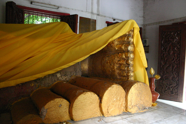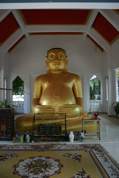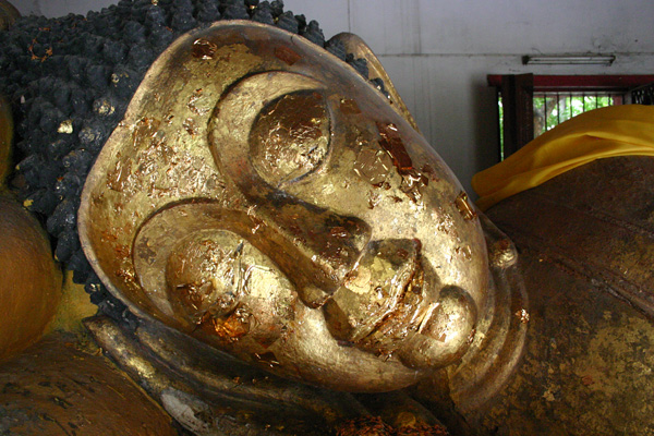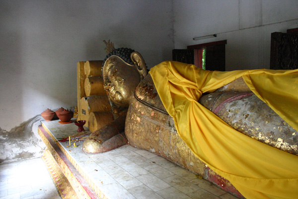 Auch hier findet sich wieder ein Viharn und weitere Gebäude, unter anderem auch ein kleines, in dem sich ein liegender Buddha befindet. Auf der Anlage werden wir von einem jungen Mönch angesprochen der uns bittet, ob wir etwas Zeit hätten. Er sei Student und müsse drei Interviews mit Menschen aus drei verschiedenen Ländern führen. Wir nehmen uns die Zeit und er führt uns in einen Parkteil an einen Tisch, wo ein weiterer Student sitzt. Es geht irgendwie um Kultur oder Besonderheiten der Kultur in Deutschland im Verhältnis zu Thailand. Beide sind sehr aufgeregt. Das Englisch dessen, der uns angesprochen hat, ist gewöhnungsbedürftig und wir schaffen es leider nicht so recht zu verstehen, was denn nun die drei Fragen sind, die sie uns stellen sollen. So unterhalten wir uns freundlich mit viel Lachen – aber ein Interview wird es nicht mangels der Sprachprobleme. Wir erfahren aber immerhin, dass die Mönche sich nach Buddha in 7 verschiedene Farben kleiden können, heute aber nur noch drei Farben genutzt werden: Ein tiefes weinrot, fast Terrakottaton, welches aber nur hier vorkommen soll und wohl eher aus der Ecke von Birma stammt; ein sattes gelb und ein orange.