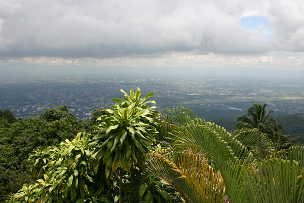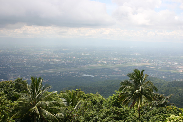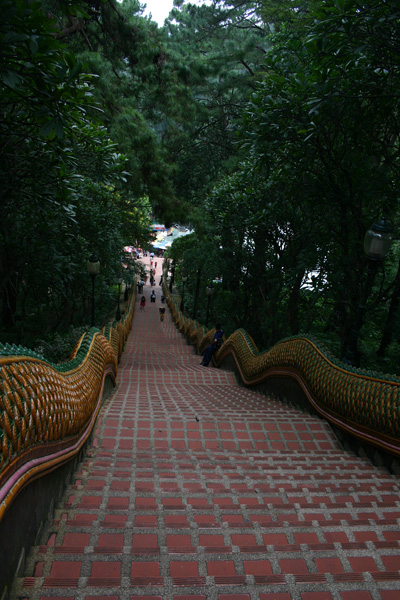 Der Wat Doi Suthep liegt in 1.053m Höhe unterhalb des Gipfels des Doi Pui. Auf Initiative eines Mönches, der das Geld hierzu bei den Einwohnern von Chiang Mai gesammelt haben soll, die sodann auch beim Bau geholfen haben sollen, wurde 1934 die Straße hoch zum Tempel gebaut. Oben angekommen gelangen wir über eine Treppe mit 306 Stufen (ich habe sie nicht nachgezählt, ächs,stöhn), flankiert von einer Balustrade aus sich empor windenden Leibern zweier siebenköpfiger Nagas, gelangt man auf die weite Tempelterrasse, nachdem ein Eintritt von 30 Baht pro Person gezahlt wurde. Bei klarem Wetter hat man einen tollen Blick auf Chiang Mai und die Umgebung – leider haben wir kein klares Wetter. Chiang Mai liegt recht dunkel vor uns und die goldenen Dächer sind eigentlich nicht zu erkennen. Schade, aber trotzdem schön anzusehen.
