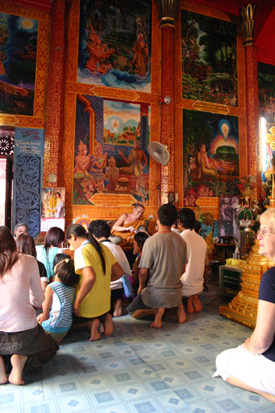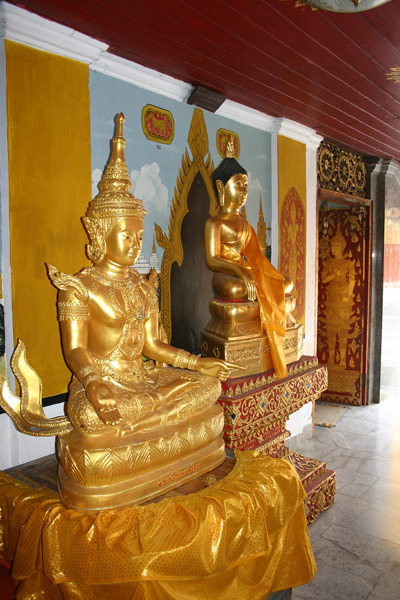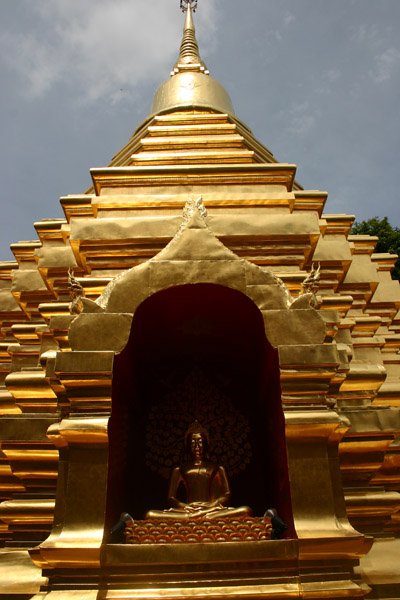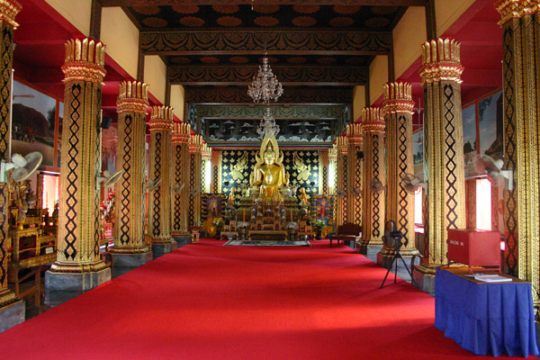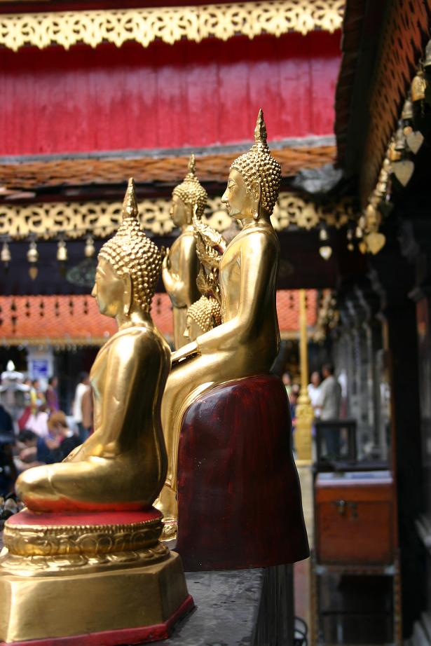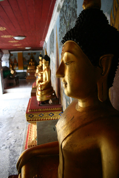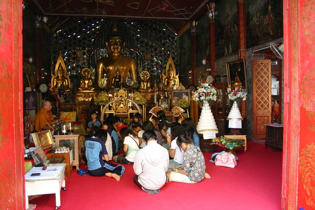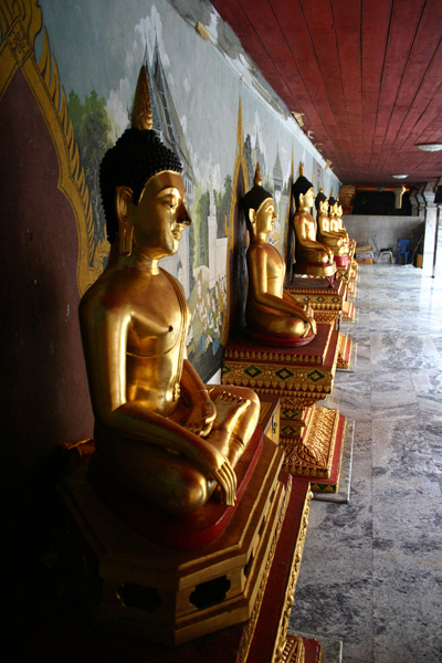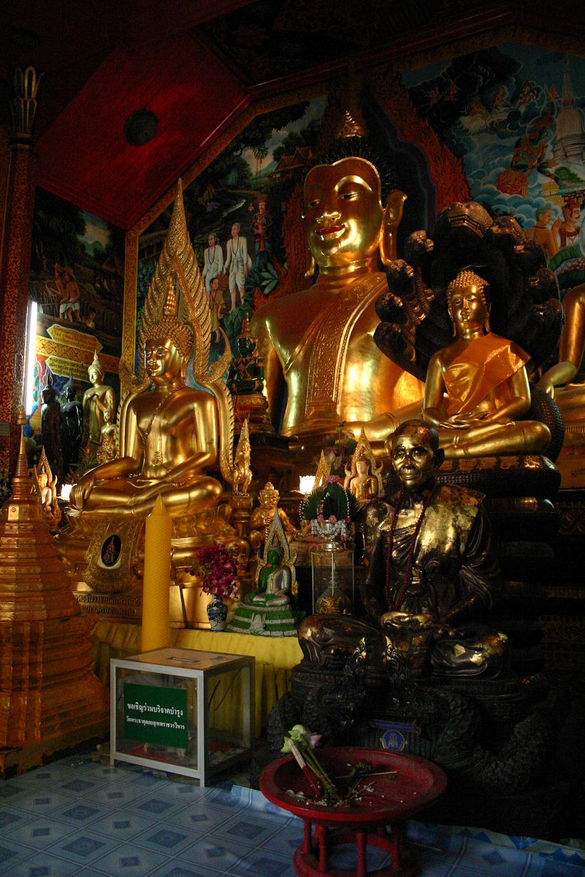 Rundherum sind Galerien mit unzähligen Buddhafiguren. In der Mitte steht ein goldener Buddha. Überhaupt sieht das Auge nur noch auf Gold, Gold, Gold. Es gibt zwei gegenüberliegende Viharn, in denen zahlreiche Buddhas sitzen und außerdem ein lebender Mönch, der die Gläubigen mit Sprüchen – für uns unverständlich – und Weihwasser berauscht bzw. besprüht. Der 20m hohe goldene Chedi ist beeindruckend was seinen Glanz angeht. Vor allem als die Sonne richtig herauskommt ist man glattweg geblendet.