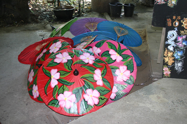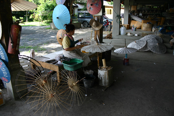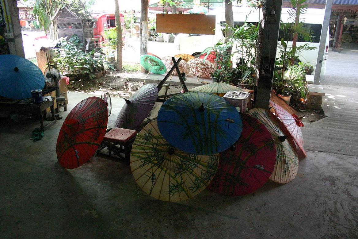 Bei der Minibusstation kommen wir nicht an – dafür werden wir an einen anderen Pritschenwagentaxifahrer weitergereicht, der uns für 150 Baht für uns alle drei dorthin und wieder zurück fahren will. Laut Reiseführer kostet die Fahrt mit dem Minibus 5 Baht – aber heute scheint eh nicht unser Tag zu sein, also nehmen wir das Angebot an. Und wir werden tatsächlich in eine Schirmfabrik gefahren, wo wir zwei Schirme für je 200 Baht kaufen. Dann geht es gleich noch weiter in eine Schnitzerei (Kauf zweier Elefantenpyramiden für zusammen 900 Baht), und in eine Lackarbeitenfabrik (Kauf eines Gefäßes für 350). Juwelier und Seidenfabrik lehnen wir ab und landen dann noch in einem Sammelsoriumgeschäfft mit Stoffen etc, in dem wir aber nichts finden, was uns gefällt und außerdem haben wir ohnehin keine Lust mehr.