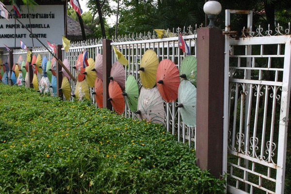 Wir vereinbaren dann für 30 weitere Baht pro Person zu einer Minibusstation am großen Fluss gefahren zu werden, wo Busse ins Wachsschirmdorf fahren sollen. Laut Reiseführer soll das Dorf Bo Sang heißen und 7-8 km weit von Chiang Mai sein. Die Wachsschirme von Chiang Mai sind berühmt und ich will unbedingt einen neuen für unser Wohnzimmer haben, wo wir einen aus dem Jahre 1982 + unsere erste Thailandreise + als Lampenschirm benutzen, der doch arg in die Jahre kommt. Und den haben wir irgendwo in Thailand – oder war es Malaysia – gekauft. Jetzt muss ein neues Original her.