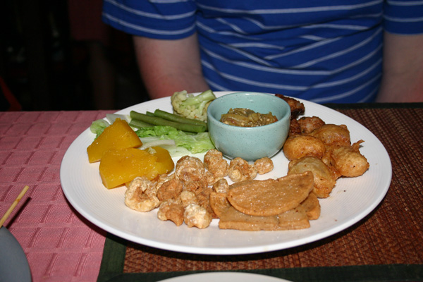 Wir essen etwas und dann gehen Jan und Okke noch einmal schwimmen im Regen. Den Rest des Tages verbringen wir dann unserer überdachten Terrasse, lesen und würfeln. Gegen 20.30Uhr gehen wir dann noch einmal Fried Rice essen – das Restaurant ist so voll, dass wir keinen vernünftigen Tisch mehr bekommen, sondern an einer niedrigen Sitzgruppe essen müssen. -