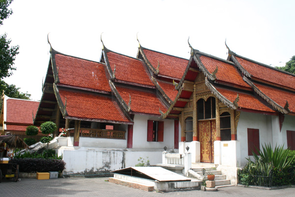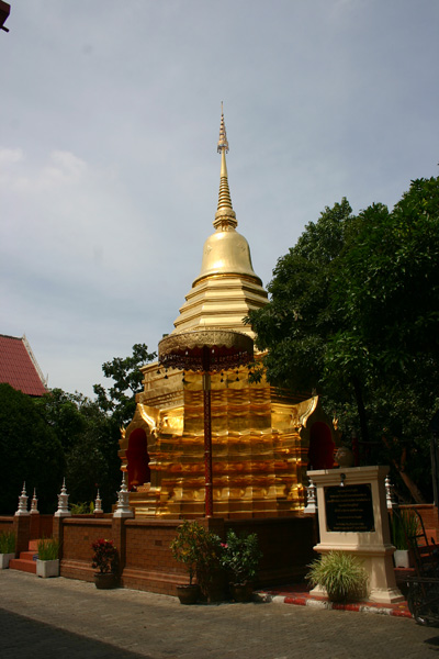hat einen wunderbaren goldenen Chedi. Der andere Wat ? ist nicht so auffällig.Es ist ziemlich heiß und wir machen schlapp, zumal in unseren Rucksäcken schon alles mitgeschleppt wird für die Reise und sie daher höllisch schwer sind. Wir gehen daher zurück ins Hotel und ignorieren dabei sogar den Sonntagsmarkt, der gerade beim Tor aufgebaut wird. Im Hotel bestellen wir dann um 12.00 ein Taxi und fahren für verhandelte 150 Baht (180 wollte der Taxifahrer erst haben) zum Flughafen zurück.