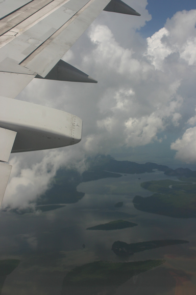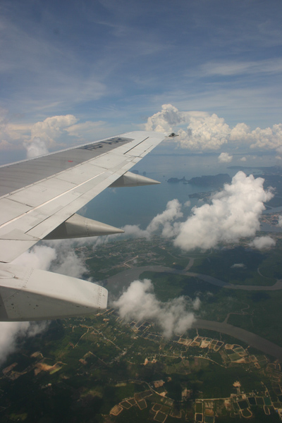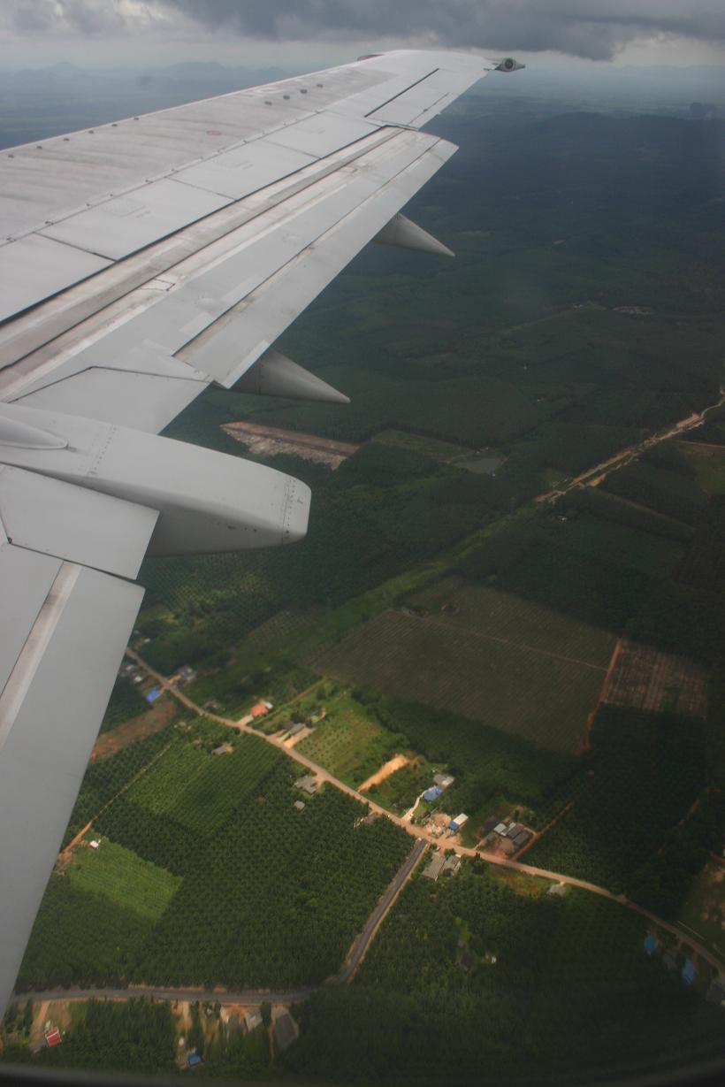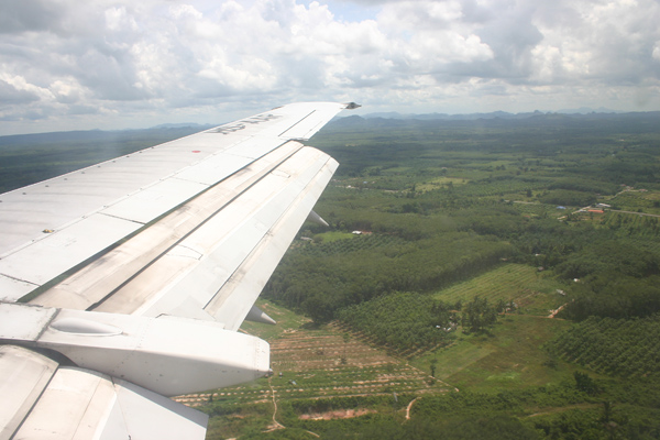 Wieder stellen wir fest, dass der Flughafen schlecht für Spotter ist. Es findet sich einfach keine Stelle von wo aus man fotografieren kann. Also gehen wir durch die Sicherheitskontrolle und warten da im oberen Bereich auf den Abflug, so dass wir zumindest etwas vom Flugverkehr mitbekommen. Air Asia verteilt keine Sitzplatznummern, sondern man hat freie Platzwahl. Auffallend war, dass im Flieger fast kaum Thais, sondern überwiegend Touristen sitzen. Ich habe mich dann so geschickt in die erste Front gedrängelt, dass wir zwei Fensterplätze bekommen, was sich wirklich lohnt, denn auf dem ganzen Flug haben wir gutes Wetter und immer Landsicht. Bei Air Asia gibt es keine kostenlosen Snacks, sondern nur Bezahlservice. Dafür kann Okke ein besonderes Flugzeugmodell erstehen, was es bei uns nicht gibt.Wir nehmen Euch mit auf den Flug nach Krabi: