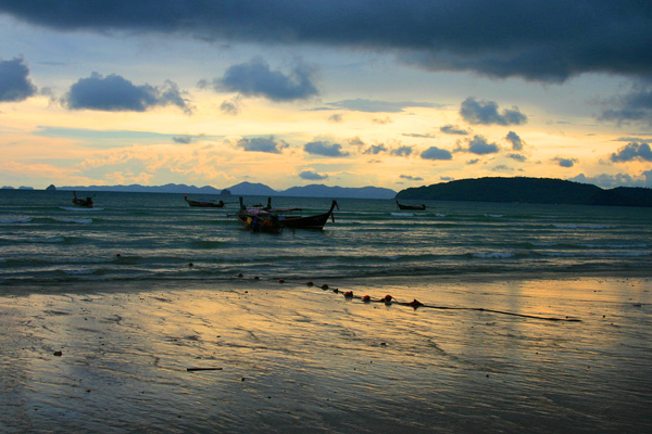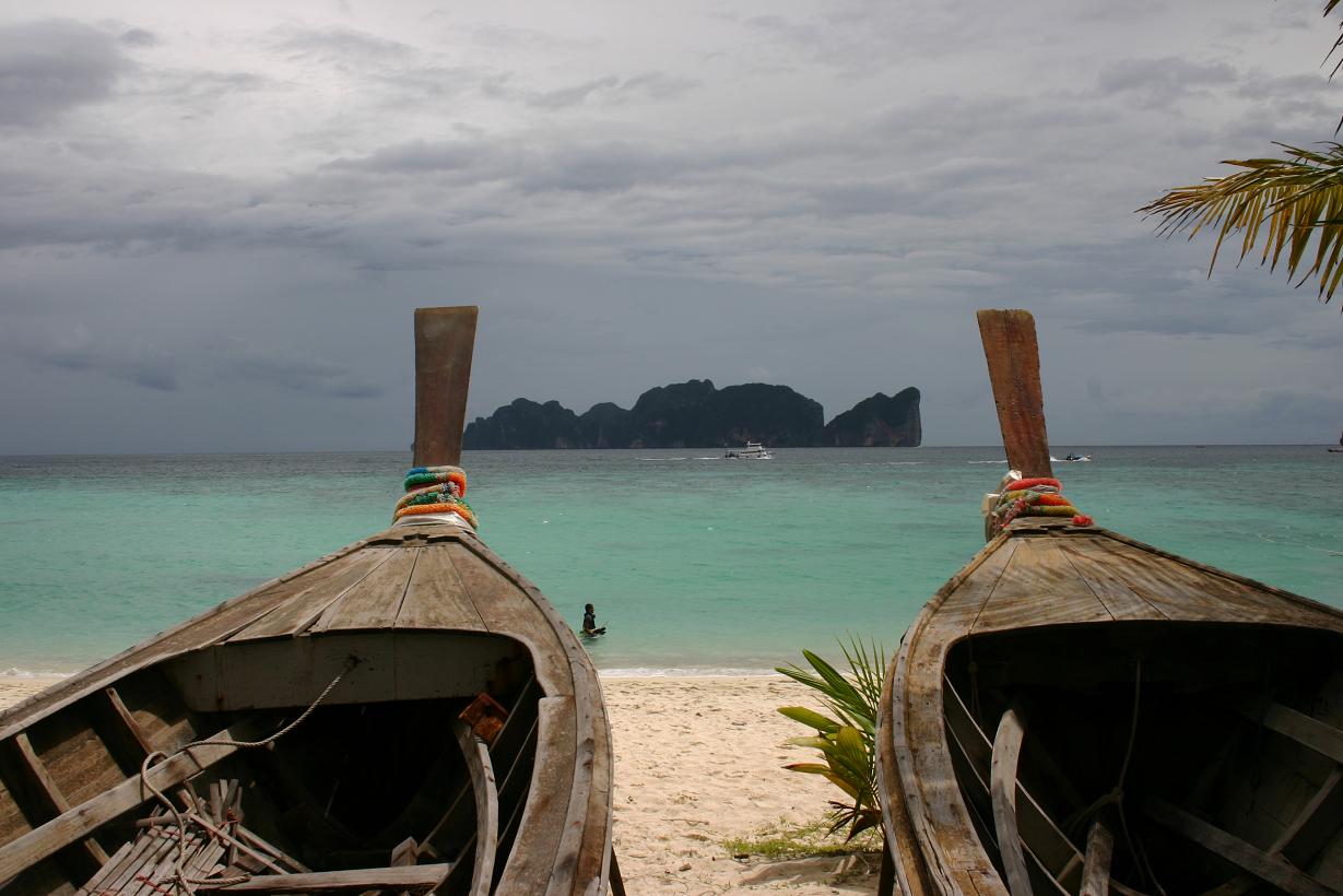 Er will das mal näher erkunden. Okke und ich verbringen die Zeit mit Würfeln, lesen. Da die Sonne nicht so knallt, lege ich mich auch eine Weile an den Strand. Es weht ein kräftiger Wind und das ist sehr angenehm. Die Lichtverhältnisse sind irre. Über dem Meer scheint ein Unwetter aufzuziehen und es verdunkelt sich der Himmel. Und vorne leuchtet das Wasser helltürkis. Es gibt kleine Wellen. Ein Longtailboot ist beim Anlanden mit Wasser vollgelaufen. Wie das genau geschehen ist, weiß ich nicht. Irgendjemand muss sich da ganz blöd angestellt haben. Nun versuchen Thais und Touristen das Wasser aus dem Boot zu bekommen, aber die Wellen rollen immer wieder über das offene Boot hinweg und neues Wasser kommt herein. Nach längerem Bemühen, bestimmt eine Stunde, gelingt es ihnen tatsächlich, wobei wohl hilfreich ist, dass das Wasser langsam wieder niedriger wird. Der Motor ist natürlich abgesoffen und das Boot muss abgeschleppt werden.