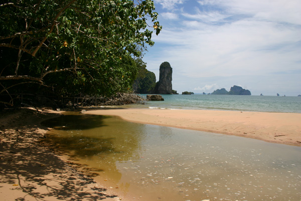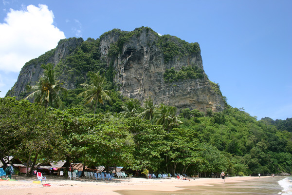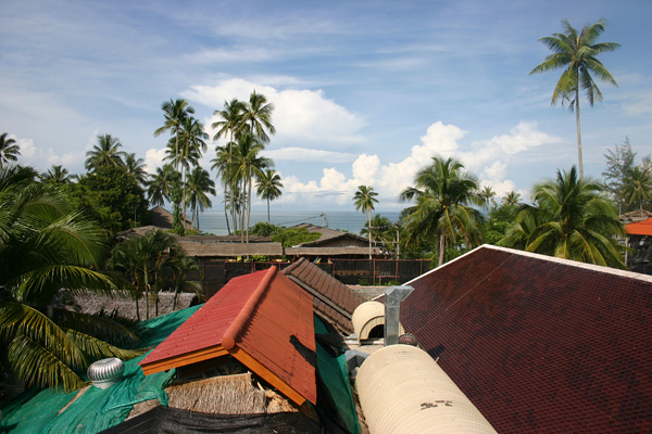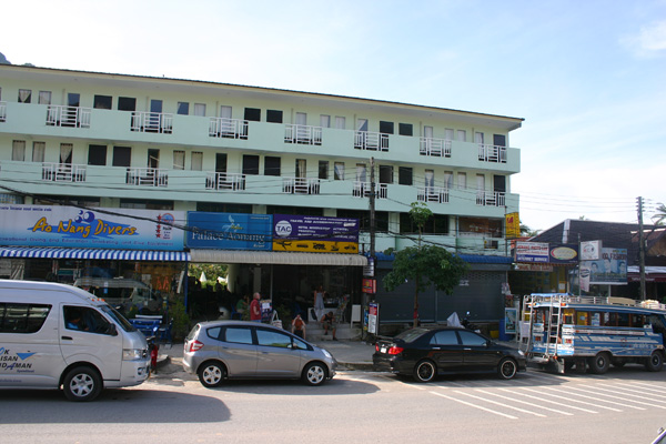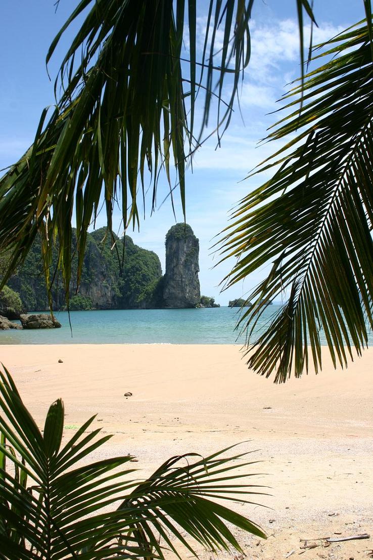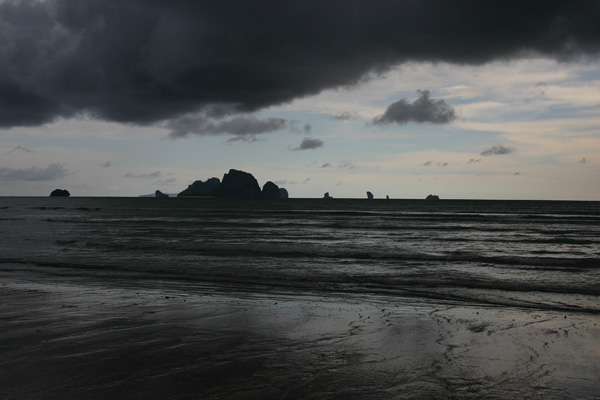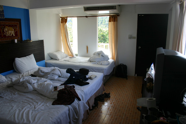 Die Fahrt dauert eine Stunde. Es gibt die kurze Zwischenstopps, wo andere Fahrgäste aussteigen. Unterwegs beginnt es in Strömen zu gießen, aber in Ao Nang ist das zum Glück vorbei. Okke setzen wir dann mit den Taschen auf eine Bank am Strand, während Jan und ich nach einer Unterkunft suchen. Als erstes fragen wir in einer Anlage direkt am Strand. Dort soll das Dreibettzimmer 3000 Baht die Nacht kosten, wobei man bei drei Nächten eine umsonst bekäme, so dass man dann auf 2000 Baht käme pro Nacht, also 40 Euro. Das ist uns eigentlich zuviel und wir wollen auch nicht unbedingt drei Nächte bleiben. Dann werden wir von einer Thai angesprochen – sie hat am Strand den Massagebereich Nr 8 und lädt uns dorthin ein. Sie fragt, ob wir ein Hotel suchen, was wir bejahen, und führt uns dann ins Palace Aonang, nicht weit vom Strand. Dort soll das Dreibettzimmer mit Meeresblick (über hässliche Dächer hinweg – aber immerhin Meeresblick) und Frühstück 1500 Baht kosten. Das Zimmer ist sehr schön, aber eigentlich wollten wir weniger bezahlen.