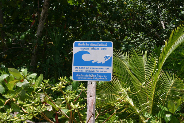 Heute ist echter Relaxtag. Wir müssen nirgendwohin aufbrechen. Nach einer recht gut durchschlafenen Nacht und einem gemütlichen Ausschlafen gehen wir zum Frühstück runter und sind überrascht über die Auswahl. Es gibt Toasts und Croissants, Eier in vier verschiedenen Zubereitungsarten, Marmeladen Würstchen,Jogurt, diverse Säfte etc und den guten Nescafe als Pulver, wie meistens hier. Aber mit Frischmilch erträglich. Wir frühstücken sehr ausgiebig und lange. Dann kaufen wir die Tickets für die Fähre morgen früh nach Ko Phi Phi. 360 Baht pro Person ist das billigste Angebot, 400 das teuerste. Und dann geht es an den Strand, nur wenige Gehminuten entfernt. Madame Nr. 8 von gestern hat uns gleich in Augenschein genommen und schleppt uns dann den Strand entlang zu ihrem Strandabschnitt. Dort bekämen wir free chairs – is all service. Ich gehe mit, die Männer hinterher. Sehr skeptisch allesamt. Die Thailänderin ist total nett, so ein strahlendes Naturell, und erzählt und erzählt. Am Strandweg stehen übrigens überall Tsunami Verhaltensschilder, die ihr schon auf den Bildern zuvor sehen konntet– von wegen Fluchtweg bei Tsunami und „bei Tsumai suchen sie höher gelegene Stellen auf“ etc. Denn auch hier war der Tsunami – aber nur in einem sehr geringen Ausmaß – anders auf Ko Phi Phi.