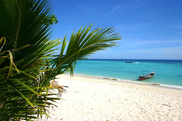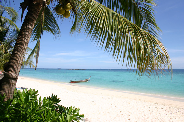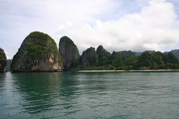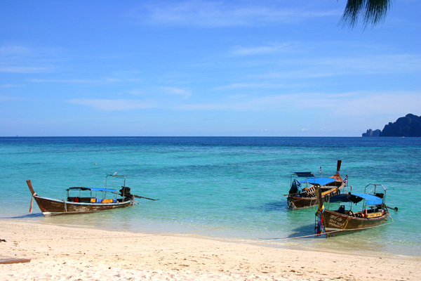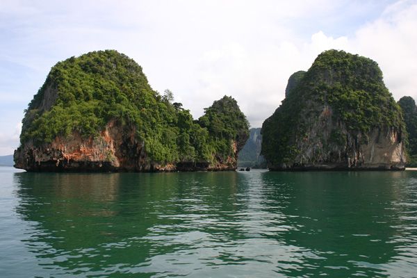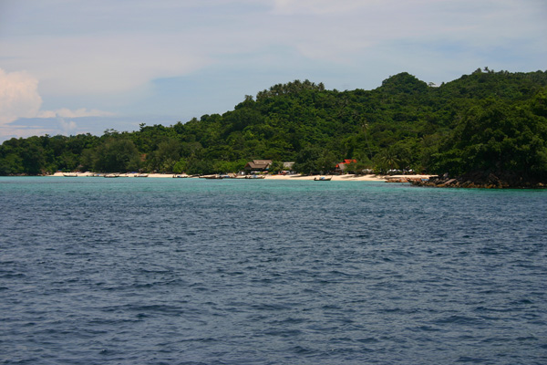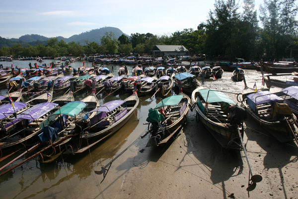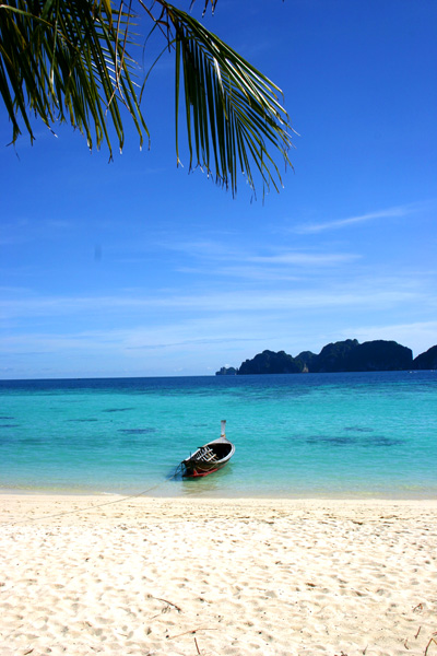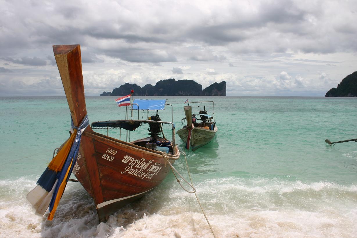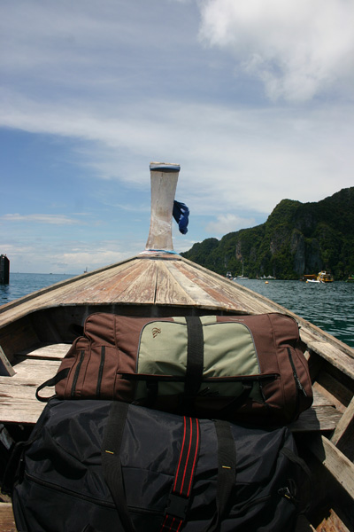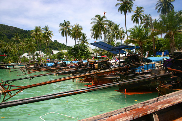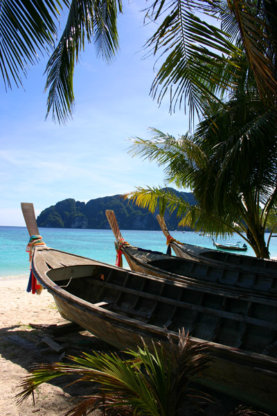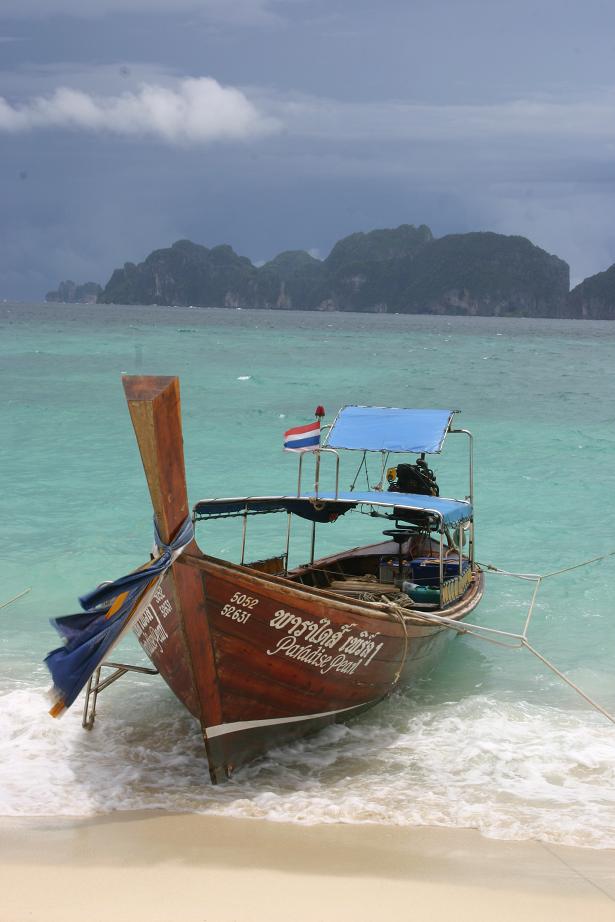 Wir fahren zunächst de Küste entlang. Leider meistens mit Gegenlicht, so dass es schlecht zum Fotografieren ist. Zwei Buchten weiter von unserem Strand werden weitere Passagiere aufgenommen. Die Sonne knallt mächtig runter und wir sitzen lieber innen im Boot. Nach ca. 1 ½ Stunden kommt Ko Phi Phi in Sicht. Wir sind sehr gespannt, waren wir doch das letzte Mal im Juli 2003 und damit vor dem Tsunami hier. Im Hauptort finden sich deutliche Spuren von dem Unglück. Die meisten Palmen, die zuvor dort dicht standen, sind verschwunden. man sieht viele neue Bauten. Wir lassen uns gleich mit einem Longtail-Boot zum Long Beach fahren, wo wir auch 2003 gewohnt haben und es traumhaft fanden.
