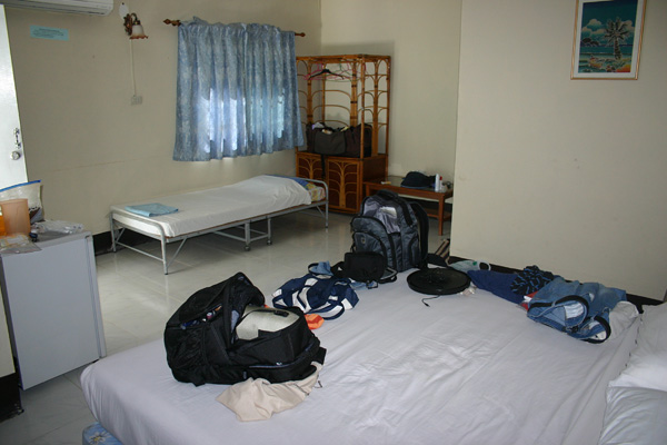Im Hotel erkennt man uns wieder. Diesmal haben wir ein Zimmer im niedrigen Nebengebäude. Ganz nett und irgendwie recht thailändisch. Aber das Doppelbett im anderen Zimmer war größer und bequemer; denn dieses ist eine dicke Matratze auf einer Bodenerhöhung und auf der einen Seite liegt die Matratze direkt an der Wand, so dass man von dort aus schlecht aus dem Bett kommt. Außerdem gibt es nur eine Deckenbeleuchtung. Leider vergesse eich ein Foto vom Zimmer zu machen.
