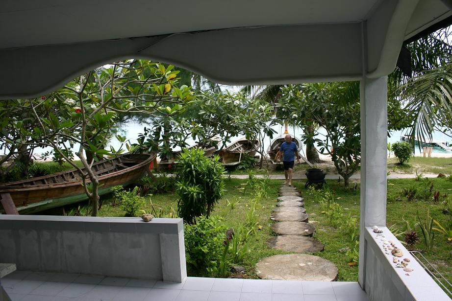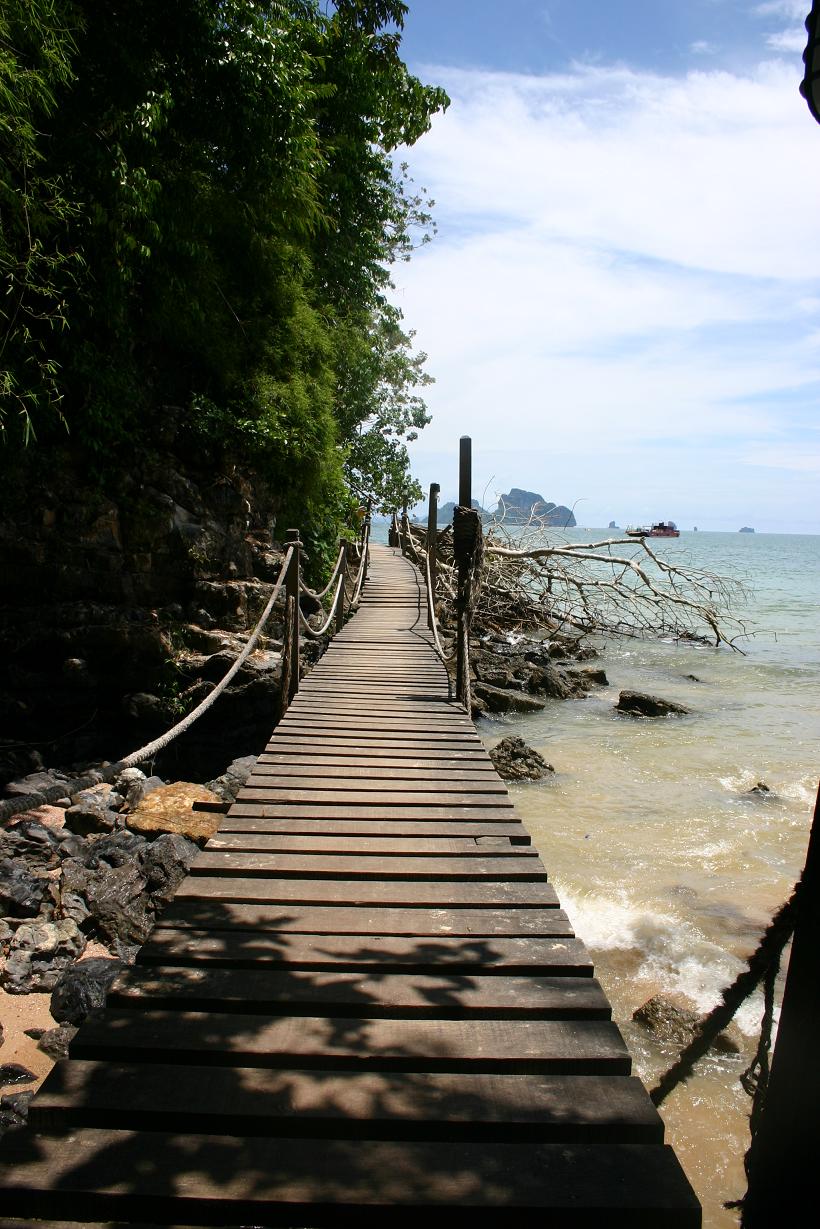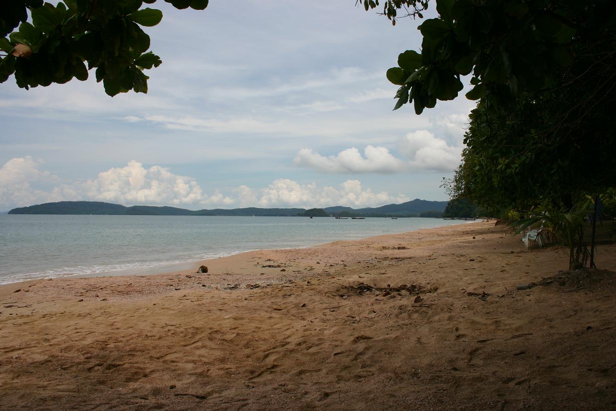 Aber wahrscheinlich muss man sich damit abfinden, dass paradiesische Zustände einfach nicht bleiben. Das haben wir 2003 schon auf Koh Samui feststellen müssen wobei es dort besonders krass war, da ja zwischen unserem ersten und dem zweiten Besuch 22 Jahre lagen. Jetzt sind es nur 5 und ein Tsunami. Long Beach hat sich auf den ersten Blick wenig verändert, auf dem zweiten erheblich. Der Strand und das türkis blaue Wasser ist geblieben. Aber es gibt mehrere neue Anlagen. Die einfachste Anlage mit einfachsten Bambus-hütten ist komplett verschwunden. Dafür steht in dem Hügel am Ende des Strandes ein Bungalowdorf mit Stelzenhäusern. Wir fragen gar nicht erst nach dem Preis, zumal wir die Rezeption nicht finden und gerade ein Tagestouristenboot anlandet. Das gab es früher auch ncht. Die Anlage, wo wir damals waren, gibt es noch und auch noch etliche von den damaligen Häusern. Unser Haus hingegen, ganz am anderen Ende des Strandes, steht nicht mehr. An dessen Stelle wird gerade eine Anlage im Thaistil gebaut, wirklich toll – aber ich möchte nicht wissen, was der Urlaub dort kostet. Entsprechend ist das Preisnivau der anderen Anlagen nach oben gegangen. Es gibt noch eine einfache Anlage mit einfachen Holzhütten und Ventilator für 500 Baht in der Strandreihe und 300 weiter hinten, aber die haben nur eine kleine Hütte für 2 Personen frei, so dass dies für uns nicht in Frage kommt. In der Anlage von früher will man für eine 2 - Personenhütte mit Zustellbett 1600 Baht und soviel kostet es auch eine Anlage weiter. Die Hütten sind ok, nicht aber gehobener Standard, sondern schon etwas älter. Dagegen war das Zimmer der letzten nacht in Ao Nang Klassen besser. Aber es gibt auch noch Bambushütten ohne jeden Komfort für 300 Baht, oder kleine Hütten für 2 Personen mit Ventilator für 800. Wir nehmen eine Hütte für uns 3 mit Aircondition, eigenem Bad und direkter Strandlage für 1600 Baht. Es gibt eine kleine Terrasse wo man etwas von der Sonne geschützt sitzen kann. Und der Blick ist toll. Das Bad im Meer auch, aber es folgt die nächste Enttäuschung: Die Korallen sind weg. Vor 5 Jahren war die ganze Bucht voller Korallen und bei Ebbe konnte man zwischen ihnen hindurch wandern. Jetzt sind sie weg. Folgen des Tsunamis? Immerhin entdecken Jan und Okke später noch eien Stelle, wo es noch welche gibt. Und dann die dritte Enttäuschung: Den ganzen Tag knattern die Longtailboote vor dem Strand entlang. Das ist nervig und hört erst auf, als der Wasserstand erheblich gesunken ist. Man hat hier erhebliche Wasserstandsunterschiede. Stellenweise gibt es richtig wattenmeerähnliche Zustände.Trotz alledem ist es noch ein wunderschöner Flecken und wir wären begeistert, wäre dies unser erster Besuch. Wir werden die Zeit hier genießen.
