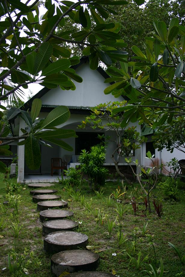 Ein kleines Stückchen weiter ist das Orchid und ich meine, dass wir dort 2003 gewesen wären. Damals waren es ältere Bungalows im einfachen Stil und Zustand, dafür recht preiswert und ruhig. Jetzt steht da eine ganz neue Anlage mit tollen superschicken Bungalows und einem zusätzlichen mehrstöckigen Gebäude. Wir sind verunsichert, ob das die Anlage von früher ist, bzw. die Stelle, wo die alte Anlage war. Ich muss zuhause mal in den Reisebericht schauen. Die Anlage sieht toll aber auch recht teuer aus. Auf unsere Frage nach einem Dreibettzimmer wird eine Preisaufstellung herausgeholt, auf der der sagenhafte Preis von 5700 Baht steht. Der wird dann auf den Saisonpreis von 2500 Baht reduziert. Das ist uns eigentlich wirklich viel zu viel, aber wir schauen das Zimmer einmal an. Es ist ähnlich wie das vom Palace Aonang, aber weniger hell und freundlich. An der Rezeption erklären wir, dass der Preis zu hoch ist, der daraufhin auf 2000 sinkt. Wir erklären, dass wir drüber nachdenken.