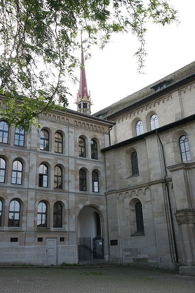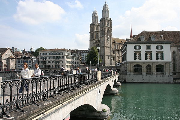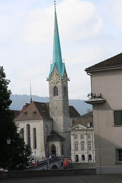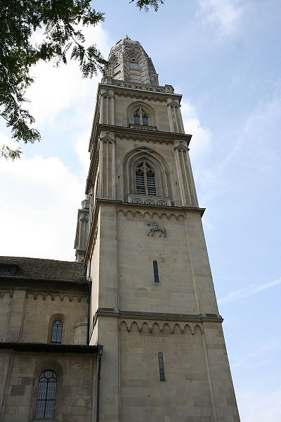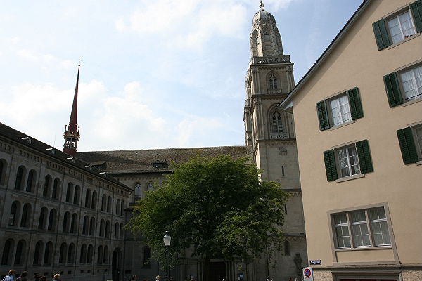 Wir kommen zum Großmünster, hier nahm Anfang des 16. Jh. die Reformation ihren Anfang unter Huldrych Zwingli. Die Doppeltürme sind auch das Wahrzeichen der Stadt Zürich.