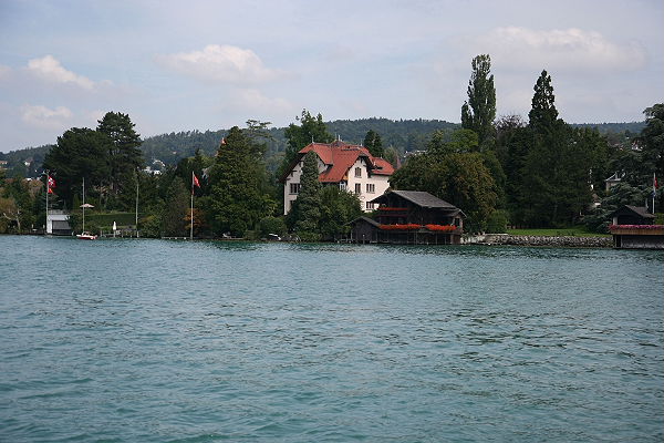 Immer wieder legte das Schiff an, um Fahrgäste aufzunehmen oder hinauszulassen. Der Zürichsee hat die Form einer Banane. Am Ufer sehen wir jede Menge Badeanstalten.