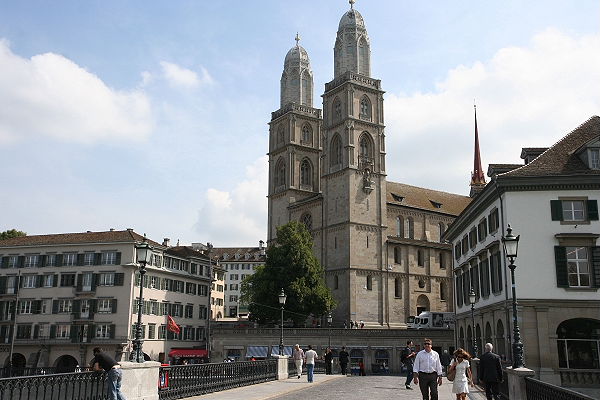 Wir kommen zum Großmünster, hier nahm Anfang des 16. Jh. die Reformation ihren Anfang unter Huldrych Zwingli. Die Doppeltürme sind auch das Wahrzeichen der Stadt Zürich.