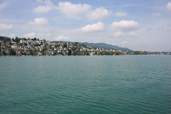 Immer wieder legte das Schiff an, um Fahrgäste aufzunehmen oder hinauszulassen. Der Zürichsee hat die Form einer Banane. Am Ufer sehen wir jede Menge Badeanstalten.
