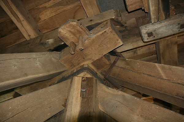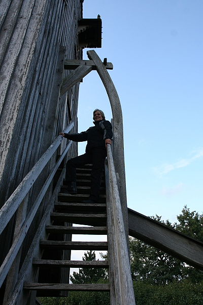 Mit einem langen Steert und einem Flaschenzug wurde die Mühle in den Wind gedreht. Auf der Rückseite ist eine Treppe (auch sie hat natürlich keinen Kontakt zum Boden) nach oben ins Innere der Mühle.