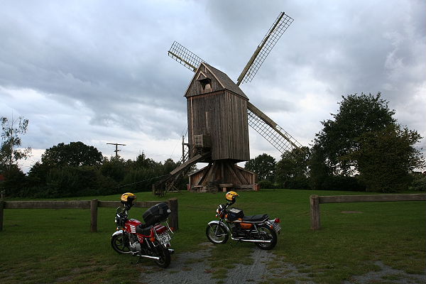Wir fahren auf der "Westfälischen Mühlenstraße". Nun halten wir auch an der Bockwindmühle in Oppenwehe. Die Mühle stammt vermutlich schon aus 1705 und wurde 1873 am jetzigen Standort wieder aufgebaut. Die Bockwindmühlen sind die ältesten Mühlen in Europa. Die Gerätschaften sind in einem Kasten "Bock" untergebracht, die Drehebene befindet sich unter dem Kasten.