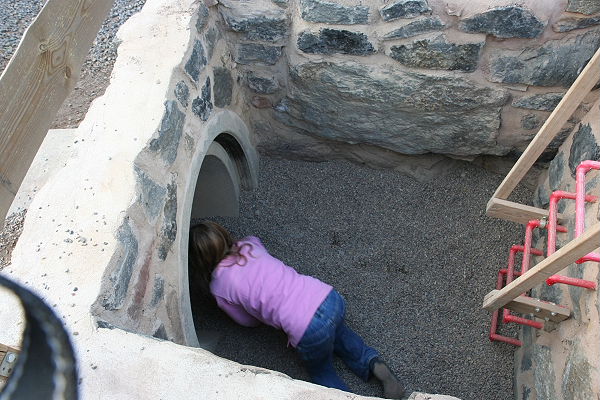 Die Höhe ist nur 90 cm, so dass man wirklich kriechen muss. Es gibt aber insgesamt 9 Austiege. Ab und zu habe ich Jenni erwischen können, wie man auf den Fotos sieht.