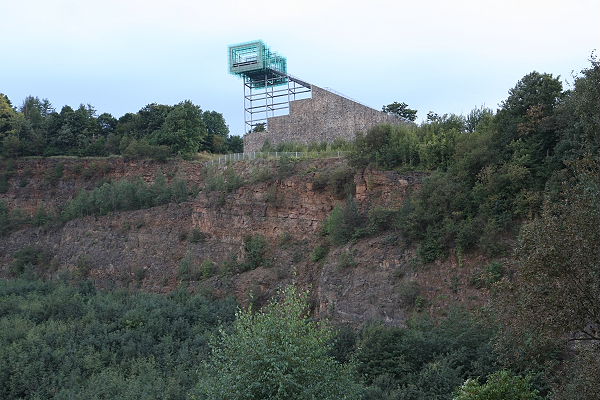Von hier aus haben wir einen guten Blick auf den aktiven Steinbruch. Schon seit 80 Jahren wird hier im Steinbruch Steinbergen Gestein abgebaut, denn der Kalkstein ist extrem hart und resistent. Die Jahresförderung liegt bei ungefähr 1 Million Tonnen.