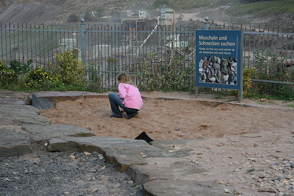 Mit einem Fernrohr suchen wir die Abbauwand nach Uhus ab, die schon seit Jahrzehnten hier leben. Leider sehen wir keinen und gehen weiter.