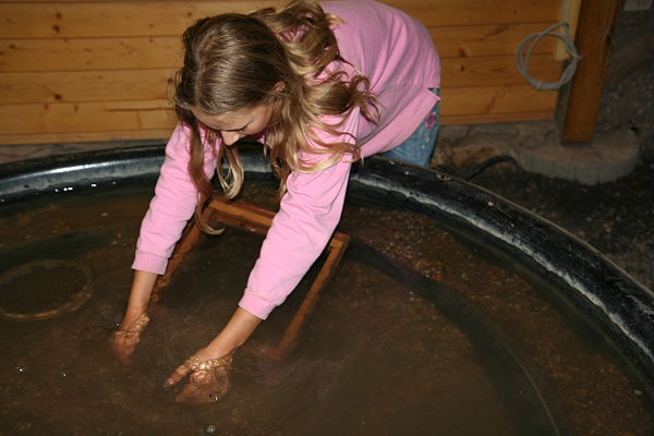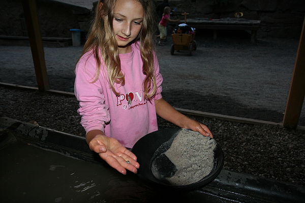 Bei der Goldwasch-Anlage hatte sie nicht so viel Glück, denn Jenni fand nur Pyrit das Katzengold, das oft mit Gold verwechselt wird. Übrigens findet man hier auf 1 Tonne Sand genau 5 Gramm Gold, wenn man Glück hat.