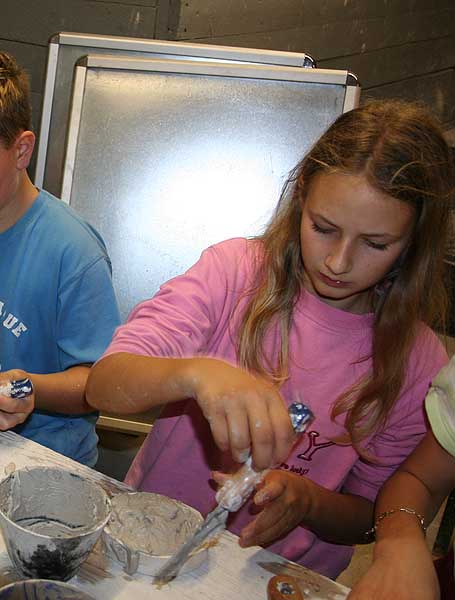 Mit einer Kinder-Theatergruppe aus Wennigsen durfte Jenni dann noch eine Form aus Gips gießen. Zuerst wurde Gips mit Wasser angerührt, dann in eine Form gegossen, die dann noch 20 Minuten trocknen musste.