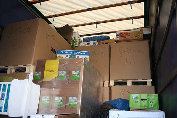 Vieles wurde bei "uns" zwischengelagert, auch im Wohnzimmer, Schlafzimmer, in der Küche, unter der Treppe. Wir fanden überall ein Plätzchen. Dann haben wir auch gleich einige Autos beladen, einiges war auch für einen Kindergarten gedacht. Mittags waren wir soweit, dass wir den LKW wieder aus der Stadt rauslotsen konnten.