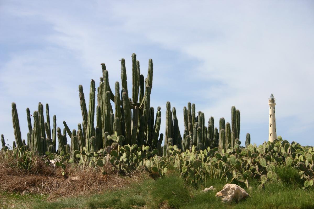 Ist man den Weg hin zum Leuchtturm an der Küste entlang gefahren, sollte der Rückweg querfeldein erfolgen. Die Strassen führen durch eine ungewöhnliche Vegetation: Karger Bewuchs, meterhohe Kakteen, Sand und Steine/Geröll, eben eine Wüstenlandschaft. Die Kakteen, die hier wachsen können bis zu 4 Jahre ohne Wasser auskommen und auf Aruba regnet es selten!