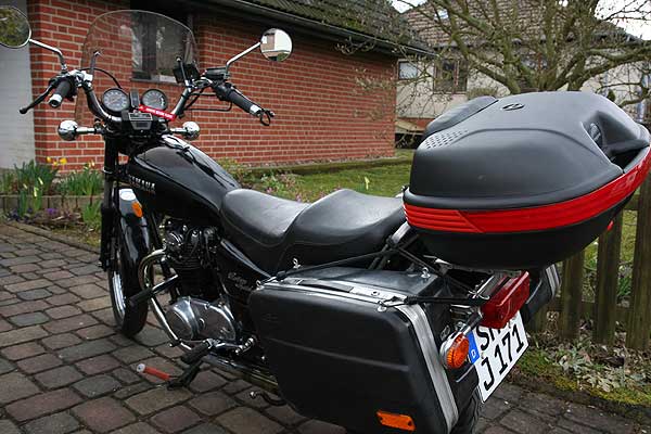 Friedrich hat sich ein großes Topcase bestellt. Gestern ist es angekommen. Es ist riesig und fast 45 l. Selbst 2 Helme passen dort rein. Da Jenni die letzten 2 Wochen mit uns reist, ist ja dann kein Platz auf den Rücksitz vorhanden. Da müssen wir schon überlegen, wo wir alle hinpacken. Denn auch Jenni bringt einen Rucksack mit.