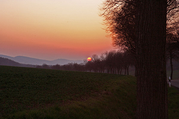 Die Sonne versinkt glutrot hinter den Bergen. -