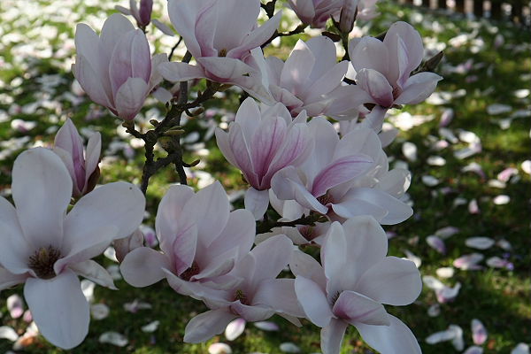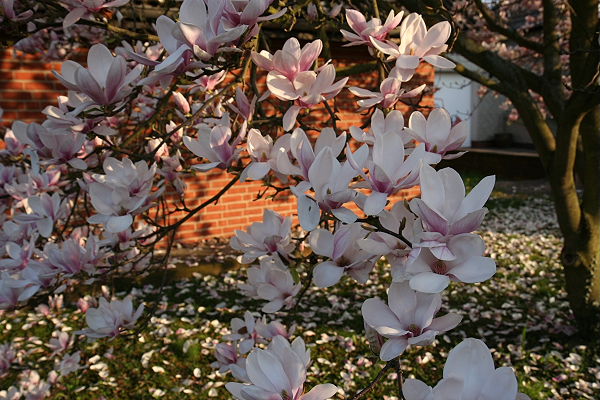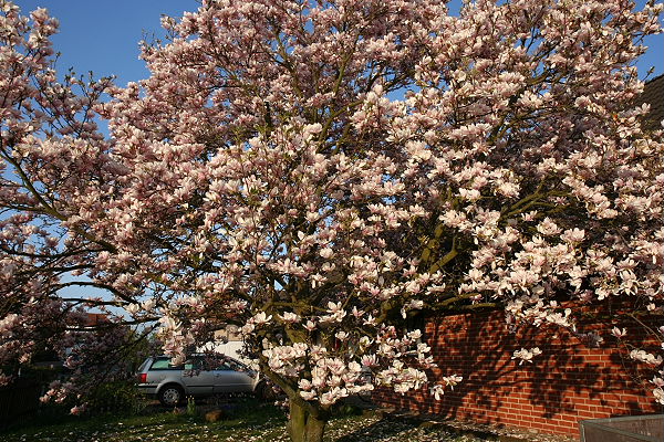 In diesem Jahr haben wir besonders viel Glück mit meiner Magnolie. Sie ist mittlerweile über 33 Jahr alt und durch das warme Wetter blüht sie wunderschön. In manchen Jahren wurden die Blüten vom Frost überrascht und fielen ab.