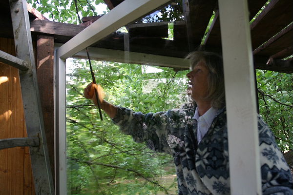 Opa probierte, ob das 1. Brett passen würde, während ich noch mit dem Fensterputzen beschäftigt war.