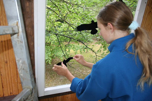 Die Vögel begruben wir. Nach der Sommerpause erzählte ich es Oma und Opa. Jetzt hatte Oma die geniale Idee, das Fenster mit Vogelschablonen zu bekleben.