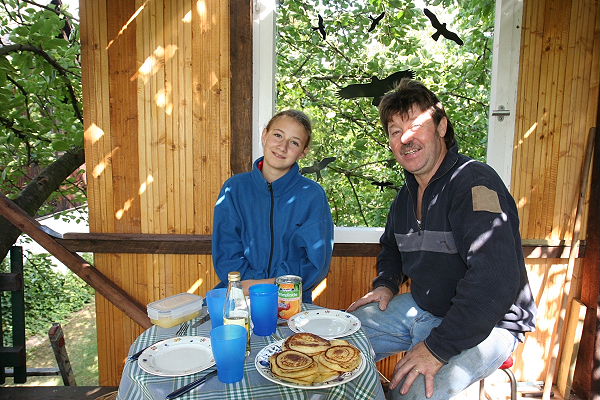 Ich putzte danach die 2. Etage, während Oma uns ein paar Pfannkuchen buk. Leider war unser Seilzug kaputt gegangen, so mussten wir uns mit "Hochreichen" behelfen, denn wir wollten ein Picknick im Baumhaus machen. Das Mahl war dennoch köstlich und danach brachten wir frisch gestärkt zwei neue Bretter an.