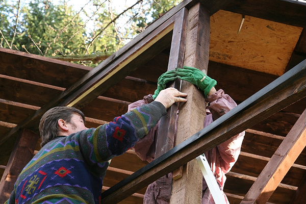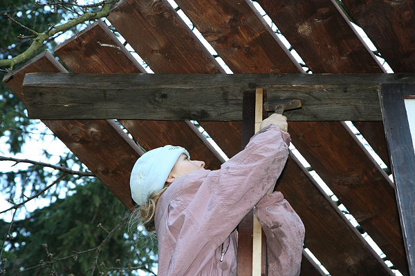 Das eine mussten wir nur auf die richtige Länge sägen und fest nageln, für das andere brauchten wir eine Schablone, um die Länge an den Schrägbalken anzupassen.