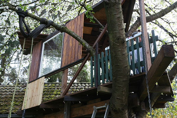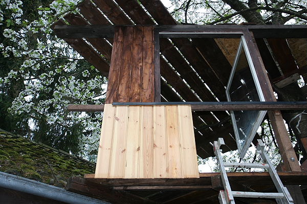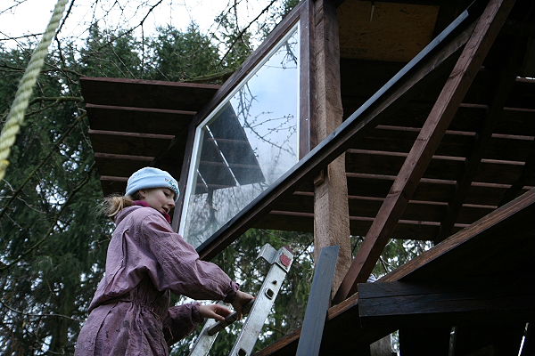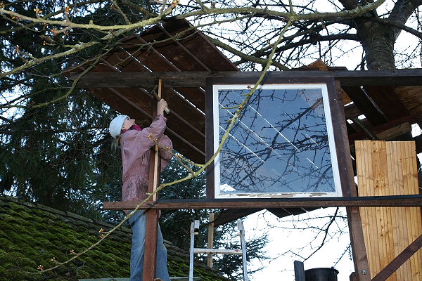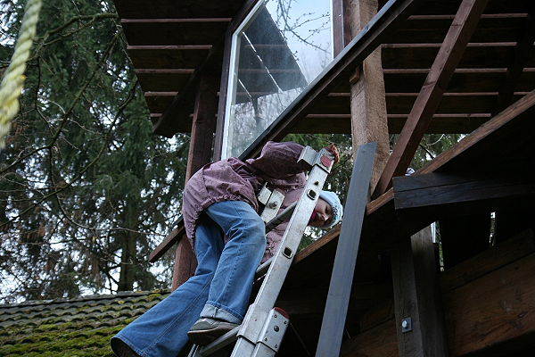 Da nun das Fenster eingebaut war, war es relativ schwierig mit der Leiter auf das Baumhaus zu gelangen, wie Ihr auf dem 1. Bild sehen könnt.