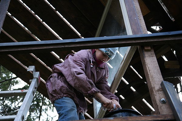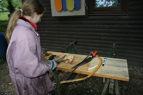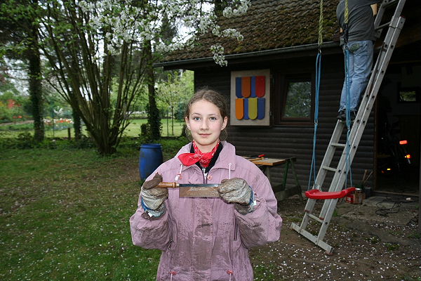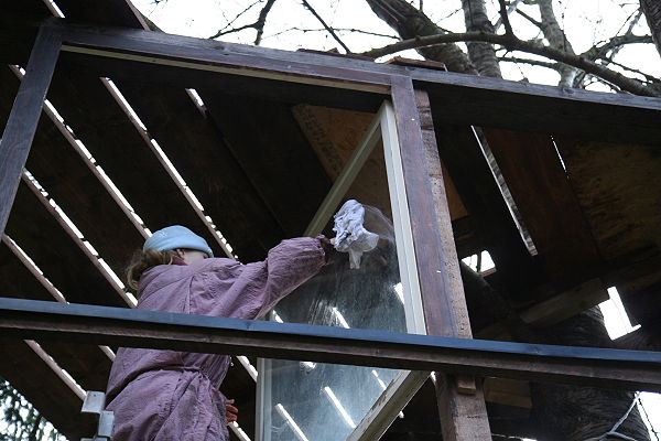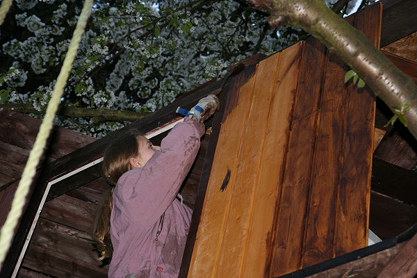 Als erstes fegten wir das Baumhaus aus und sahen mit Schrecken, dass an mehreren Stellen die Holzschutzfarbe während des Winters abgeblättert war. Außerdem waren Teile angerostet. Da Opa aber weder Holz- noch Rostschutzfarbe vorrätig hatte, gingen wir an die Nord-Ost-Seite, um dort die Wand zu bauen, bzw. das Fenster einzusetzen.