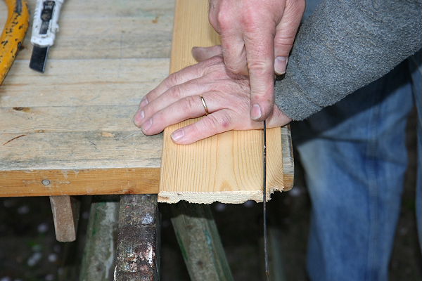 Opa holte viele Bretter aus der Hütte, von denen wir einige für die Wand neben dem Fenster nahmen. Dafür mussten wir sie zuerst alle auf die richtige Länge schneiden.