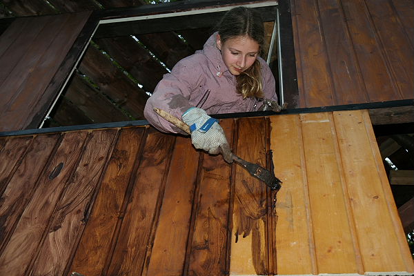 Da Opa Holzschutzfarbe besorgt hatte, konnten wir die Macken der ersten Etage beseitigen und ich inspizierte auch die 2. Etage, die noch schlimmer aussah und Opa und ich beseitigten auch dort die Mängel. Dabei unterhielten wir uns darüber, was für schreckliche Sachen passieren könnte, wenn wir die Mängel nicht beheben würden.